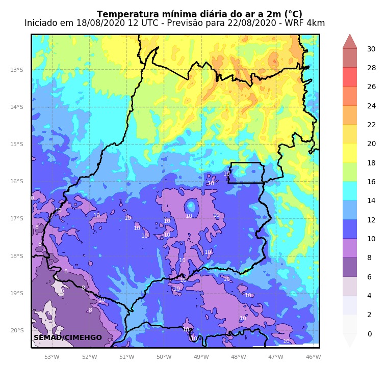 Diante deste contexto, o Centro de Informações Meteorológicas e Hidrológicas do Estado de Goiás (CIMEHGO) mostra que através dos prognósticos do modelo WRF demonstram queda acentuada nas temperaturas mínimas, devido ao avanço da massa de ar polar sobre o Brasil que irá influenciar nas temperaturas em nosso Estado, com isso a partir de quinta-feira as temperaturas já entram em declínio gradativo na região Sudoeste do Estado. Na sexta o ar frio se espalha na região centro sul do Estado. Sábado e domingo teremos ainda temperaturas baixas. Na segunda-feira a massa de ar polar perde intensidade e gradativamente as temperaturas voltam a subir.