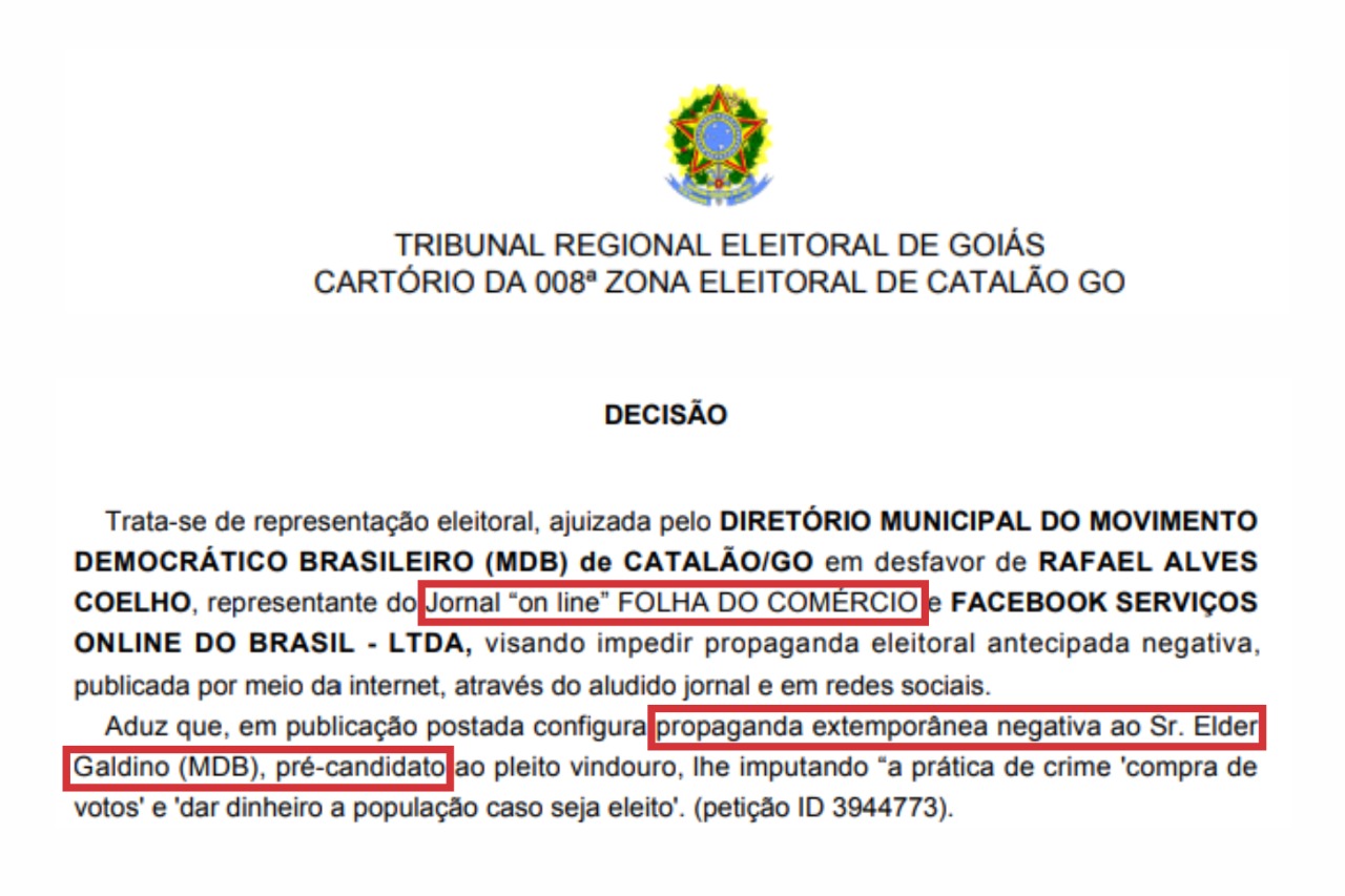 O juiz eleitoral RINALDO APARECIDO BARROS, da 8° zona eleitoral, concedeu uma decisão nesta terça-feira (11) em que obriga o Blog Folha do Comércio a retirar do blog e de seus perfis nas redes sociais várias matérias divulgadas com o objetivo de prejudicar a imagem do pré-candidato a prefeito Elder Galdino (MDB).