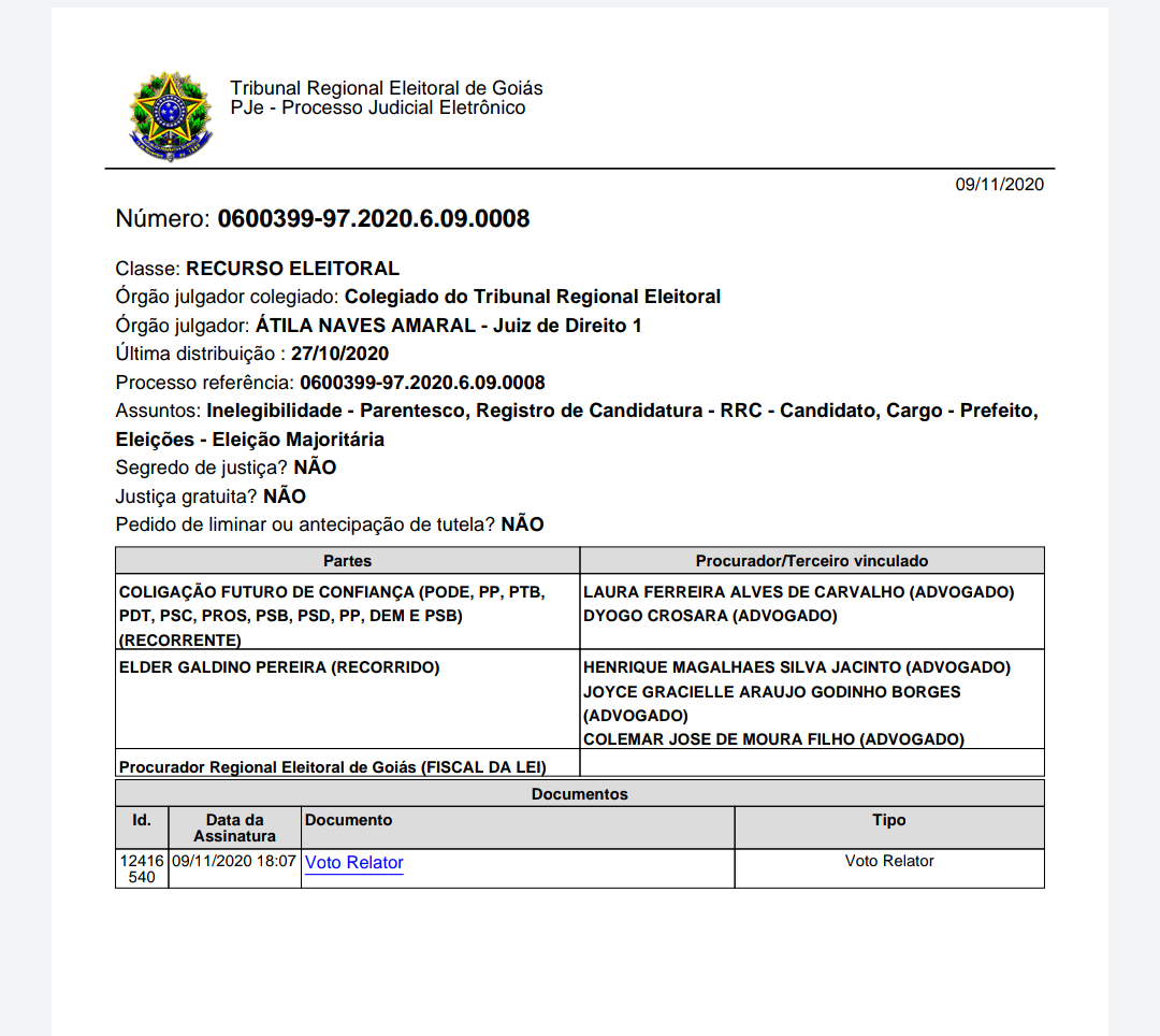 Leia a íntegra do voto do relator da matéria no TRE-GO: