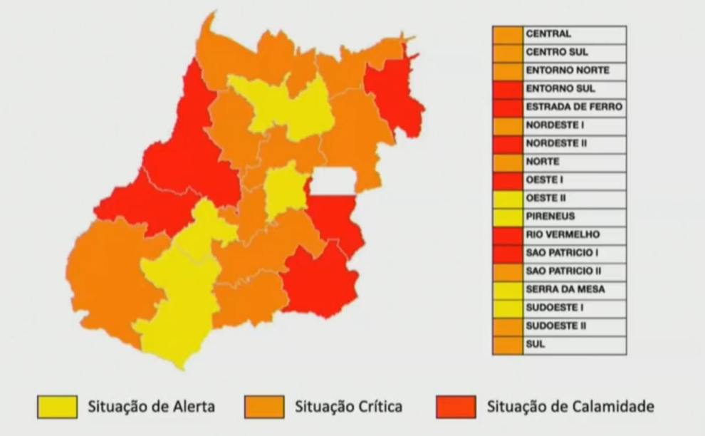 O mapa de calor aponta que, por enquanto, estão classificadas em situação de alerta a região Oeste II, Pirineus, Serra da Mesa e Sudoeste I. Enquanto isso, as regiões Central, Centro Sul, Entorno Norte, Nordeste I, Norte, Sudoeste II e Sul estão em momento crítico. Em calamidade estão Entorno Sul, Estrada de Ferro, Nordeste II, Oeste I, Rio Vermelho e Vale do São Patrício I e II.