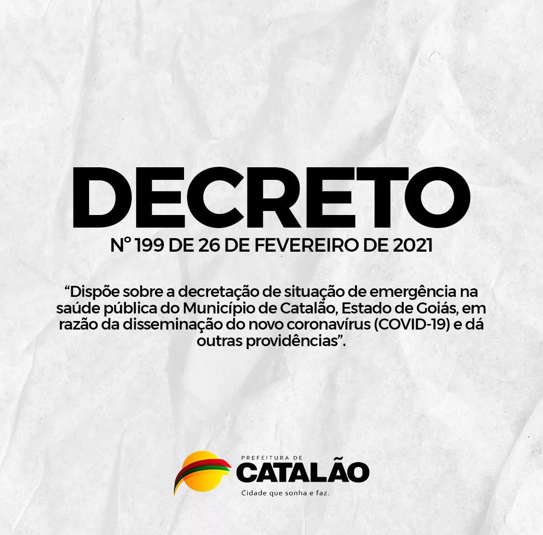 #Decreto| Em atendimento ao 17º Ato do Comitê de Prevenção, Orientação e Enfrentamento ao Coronavírus e considerando a nota técnica nº 01/2021 – SES/GO, e também que o município de Catalão se encontra localizado na Região da Estrada de Ferro, onde de acordo com o mapa epidemiológico emitido pelo Governo Estadual, encontra-se em Situação Crítica, foi assinado na tarde desta sexta-feira (26), o decreto de nº 0199/2021, que dispõe sobre a situação de emergência na saúde pública do município de Catalão em virtude da COVID-19.