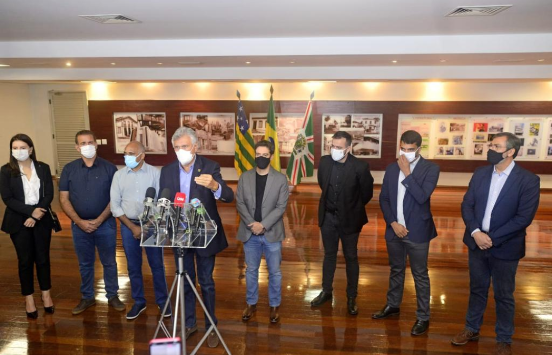 Governador Ronaldo Caiado durante anúncio de novas medidas restritivas adotadas pelos municípios da região metropolitana para conter disseminação da Covid-19: “Cumprimento os prefeitos pela coragem ao assumir uma posição em defesa da vida”*