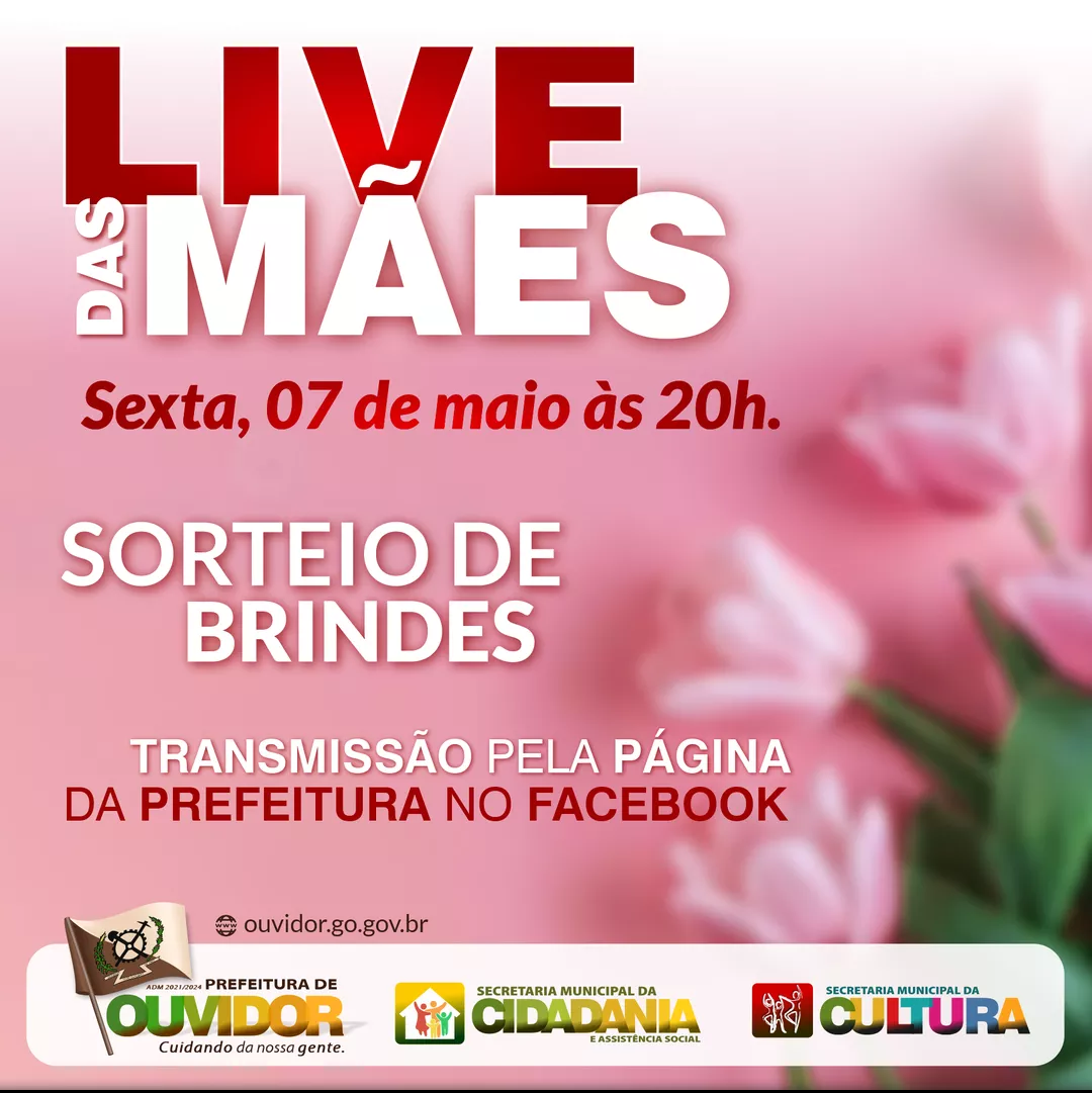 A partir das 20 horas desta sexta-feira (07) a Prefeitura de Ouvidor realizará a Live das Mães, evento que contará com a participação do prefeito Cebinha Nascimento, vice-prefeito Nelci Cândido, Vereadores e autoridades locais.