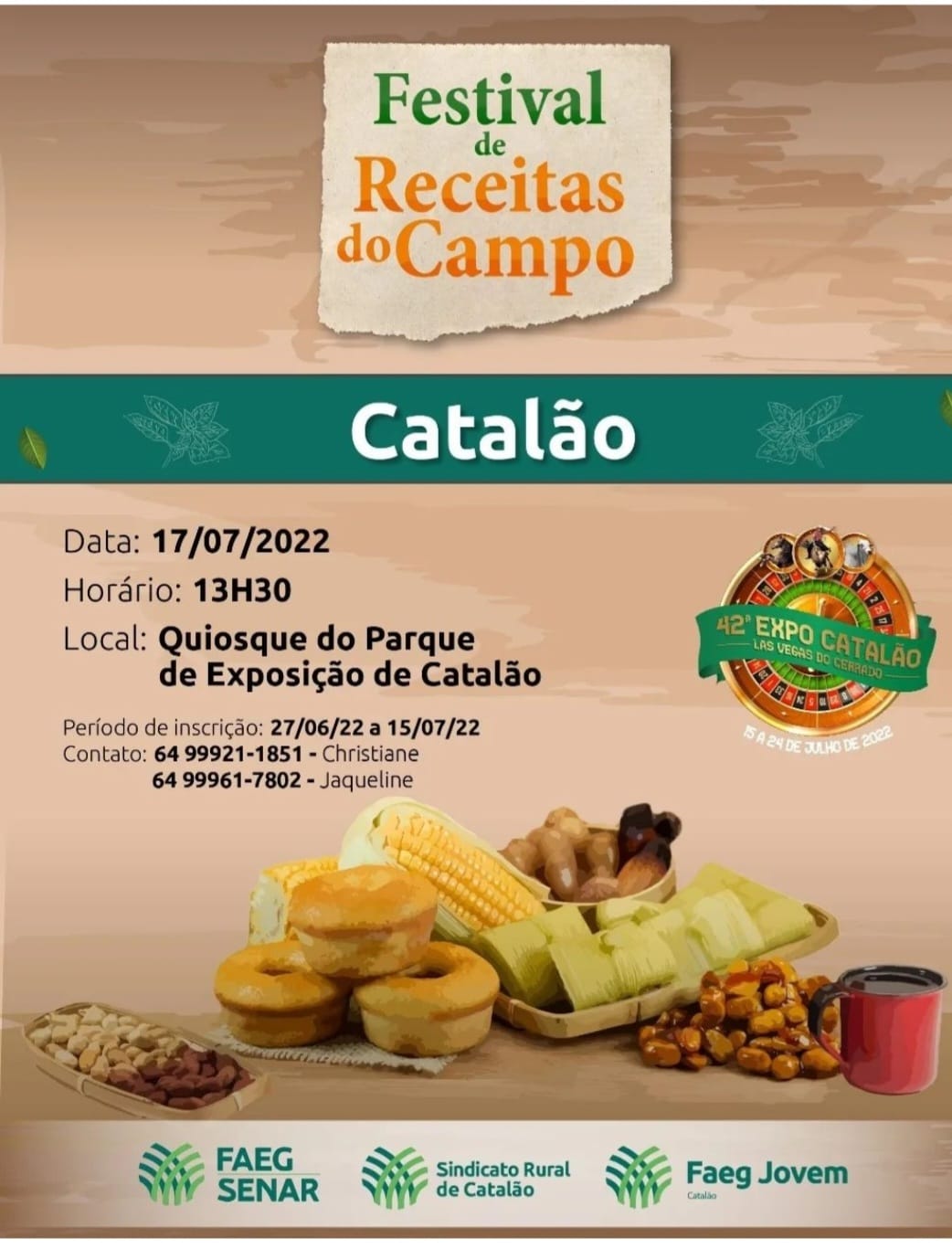 O projeto Receitas do Campo, realizado pelo Sindicato Rural de Catalão e Senar, será realizado em mais um ano, durante a Expo Catalão 2022, que acontece entre os dias 15 e 24 de julho. A data será dia 17 às 13h30, no quiosque em comum, localizado na rua do Agronegócio.