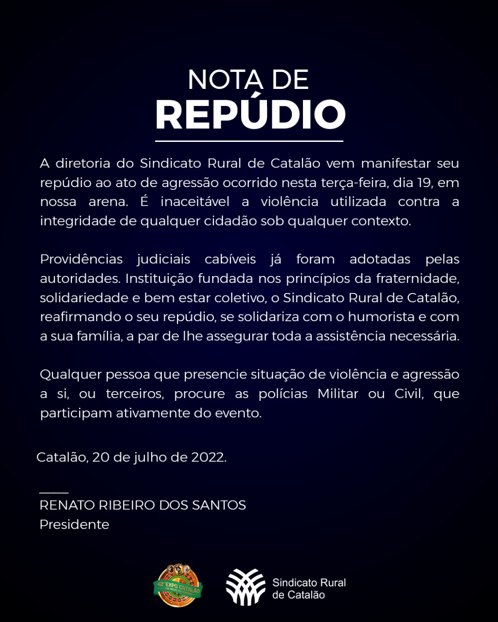 O Sindicato Rural de Catalão repudia qualquer tipo de agressão e lamenta o que aconteceu na Arena ontem, com o humorista conhecido como Boró.