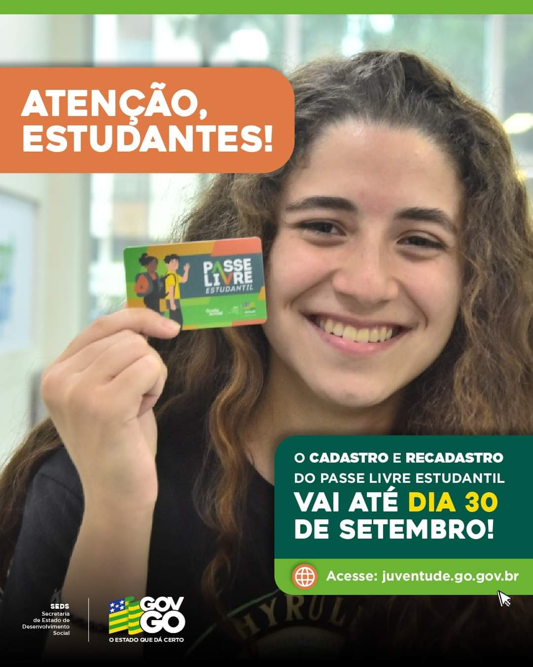 🗣️ Estudantes da Região Metropolitana de Goiânia e Anápolis, atenção!🗓️ O prazo para cadastro e recadastro do Passe Livre Estudantil termina em 30 de setembro.