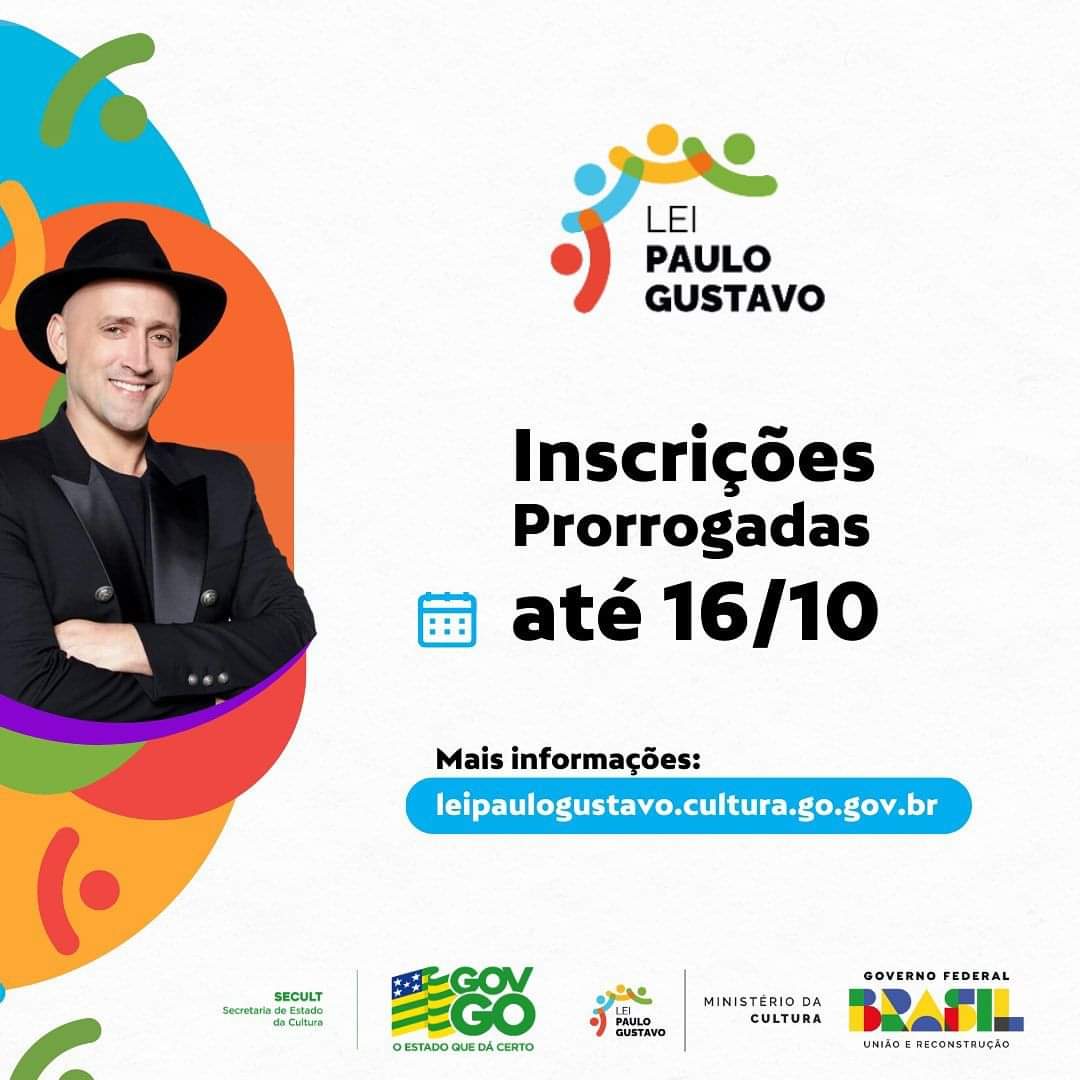 ✅ Os proponentes da Lei Paulo Gustavo agora têm um prazo estendido até às 23h59 de 16 de outubro para submeterem seus projetos na plataforma Mapa Goiano.