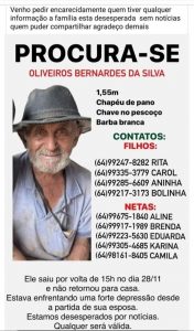 A preocupação com seu desaparecimento cresce a cada dia, e a família faz um apelo à comunidade. Caso alguém tenha informações sobre o paradeiro do senhor Oliveira, solicita-se entrar em contato imediatamente com a Polícia Militar pelo número 190. Além disso, os familiares disponibilizaram os seguintes números para contato: (64) 9 9675-1840, (64) 9 9247-8292, (64) 9 9935-3779, (64) 9 9917-1989 e (64) 9 9285-6609.