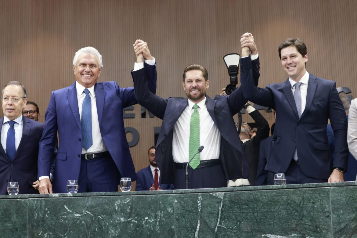 Daniel Vilela ao lado presidente da Alego, Bruno Peixoto, e o governador Ronaldo Caiado na sessão de posse da nova mesa Alego