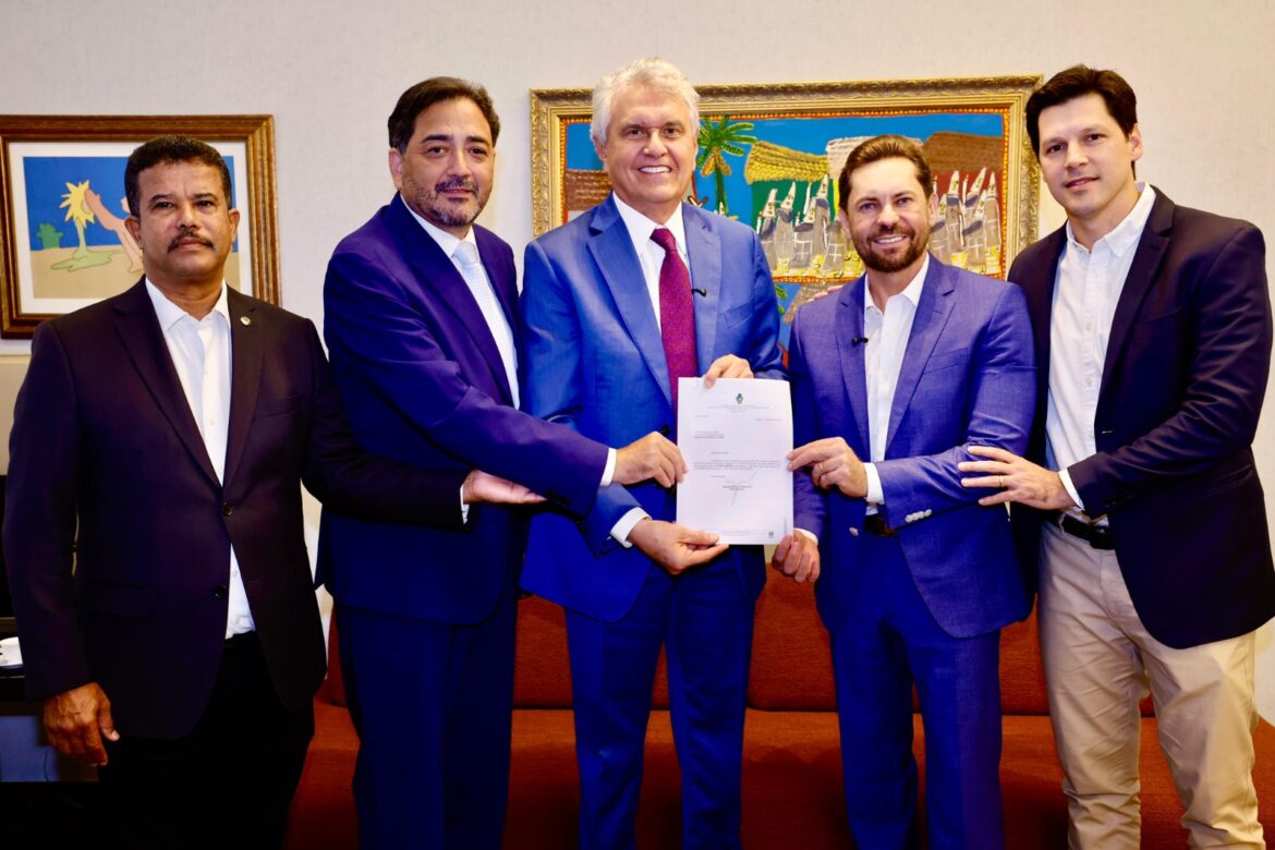 Deputado estadual, Coronel Adailton; líder do governo, deputado Talles Barreto; governador de Goiás, Ronaldo Caiado; presidente da Alego, Bruno Peixoto; vice-governador, Daniel Vilela celebram lei que concede promoção a 3.307 militares da Polícia Militar e Corpo de Bombeiros