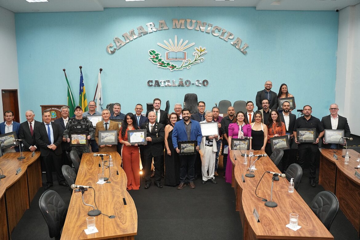 A Câmara Municipal de Catalão promoveu, na noite desta terça-feira (19/08), uma sessão solene marcada pela entrega de honrarias a dezenas de personalidades que contribuíram de forma significativa para o desenvolvimento do município. Os homenageados receberam Títulos de Cidadania Catalana e Benemérita, a Medalha Legislativa Professor Jamil Barbosa e o Mérito e Bravura Catalana.