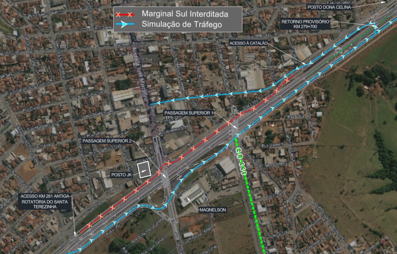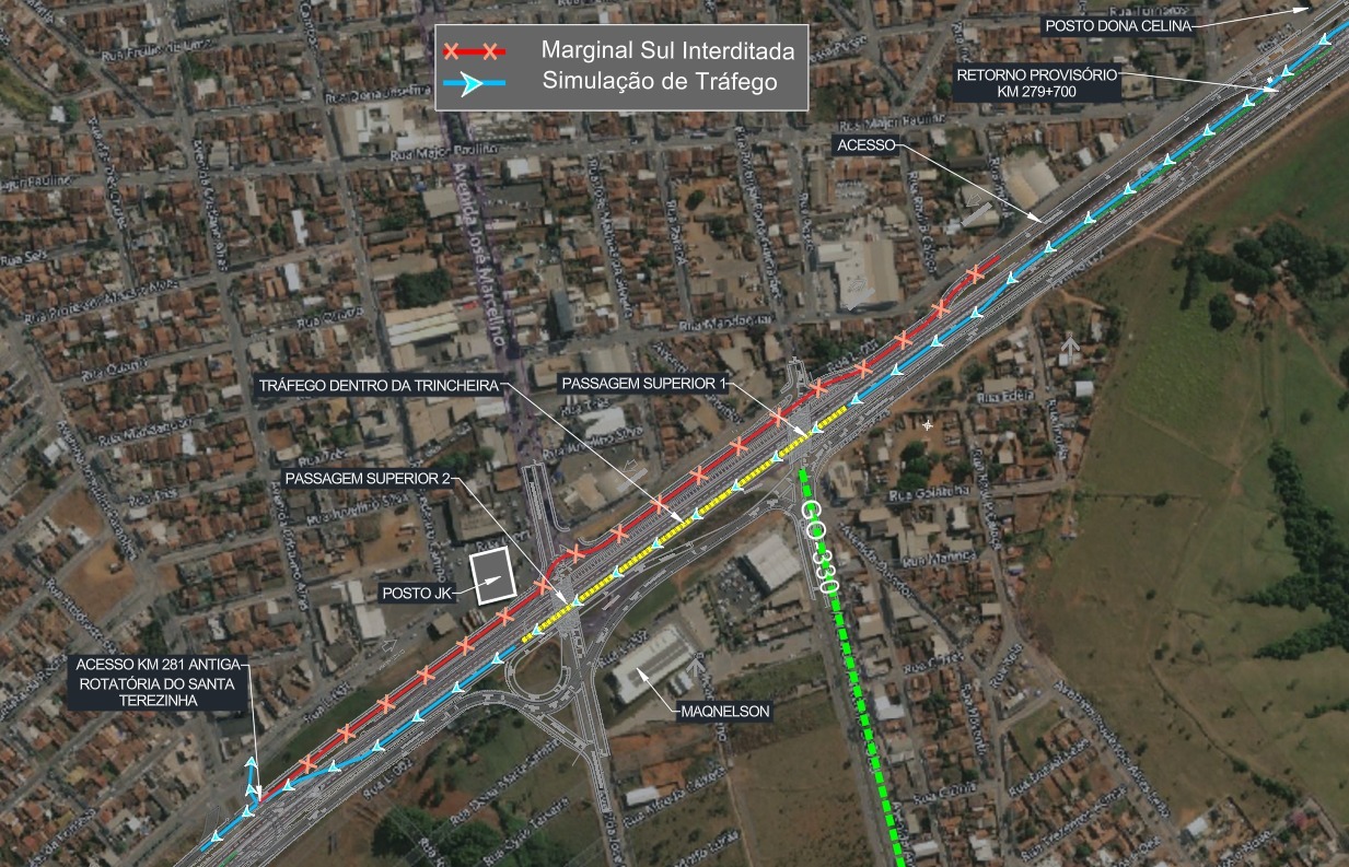 A partir de amanhã, também teremos a interdição da marginal sul, entre os km 280 e 281, próximo ao posto JK. A população continuará tendo acesso ao centro de Catalão pelo desvio no km 279. Para o motorista que utilizar a pista da trincheira, conseguirá acessar o centro da cidade pelo acesso no km 281. Marginal norte continua com fluxo normal.
