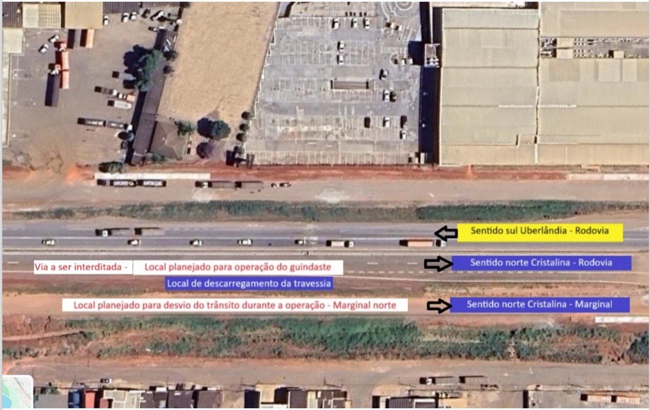 No sentido sul (sentido Uberlândia), será necessária a interdição total da faixa por até 1 hora, em dois momentos de parada total de aproximadamente 30 minutos cada, para posicionamento da peça, alinhamento da travessia e liberação dos cabos da passarela. Concluída essa etapa, o tráfego será imediatamente restabelecido no sentido sul e no retorno de acesso ao Pontal Norte.