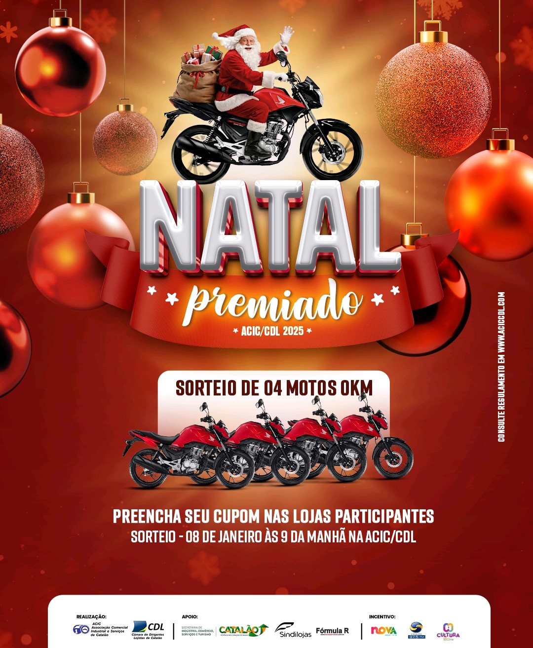A ACIC/CDL Associação Comercial, Industrial e de Serviços de Catalão realiza nesta quinta-feira, dia 8 de janeiro, às 8h30, o sorteio de quatro motocicletas Honda CG 160 Start 0km. O sorteio será realizado na sede da ACIC/CDL e transmitido ao vivo pelos canais oficiais da entidade.