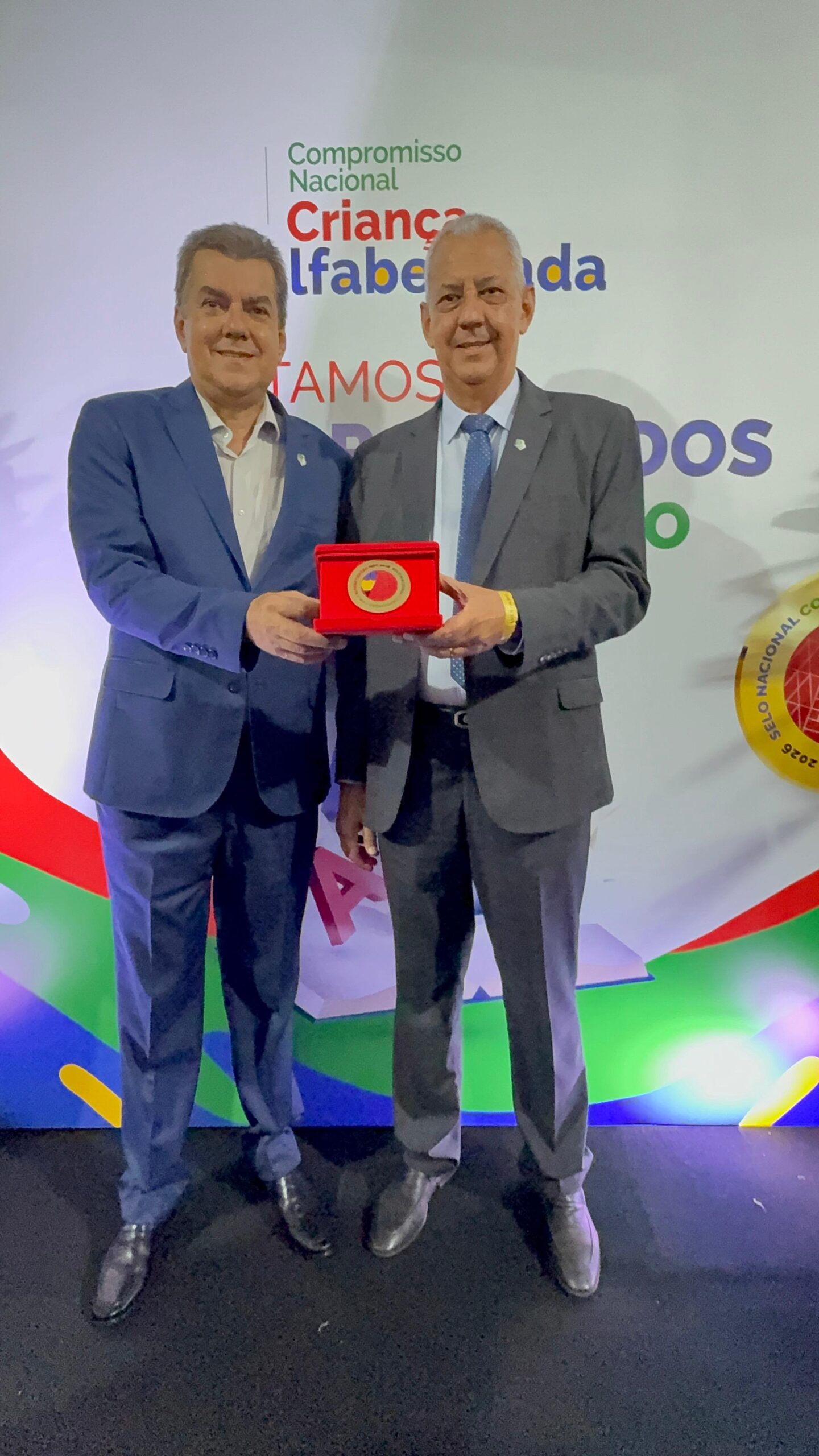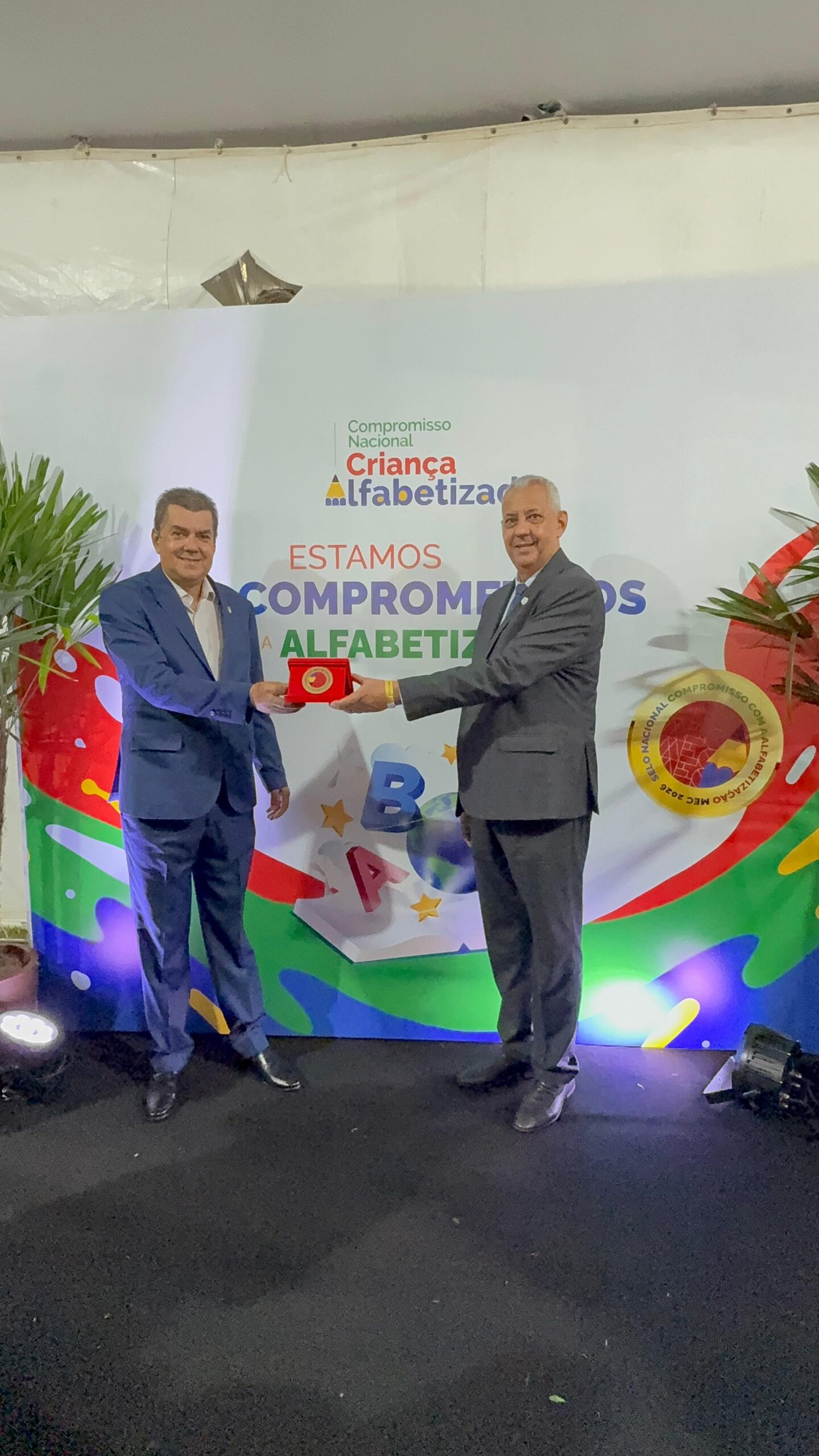 O prefeito Velomar Rios e o secretário municipal de Educação, Adilson Ciríaco, foram a Brasília nesta terça-feira (23/3) para receber a certificação, que atesta o empenho das redes públicas de ensino na adoção de ações e estratégias que assegurem o direito à alfabetização das crianças.