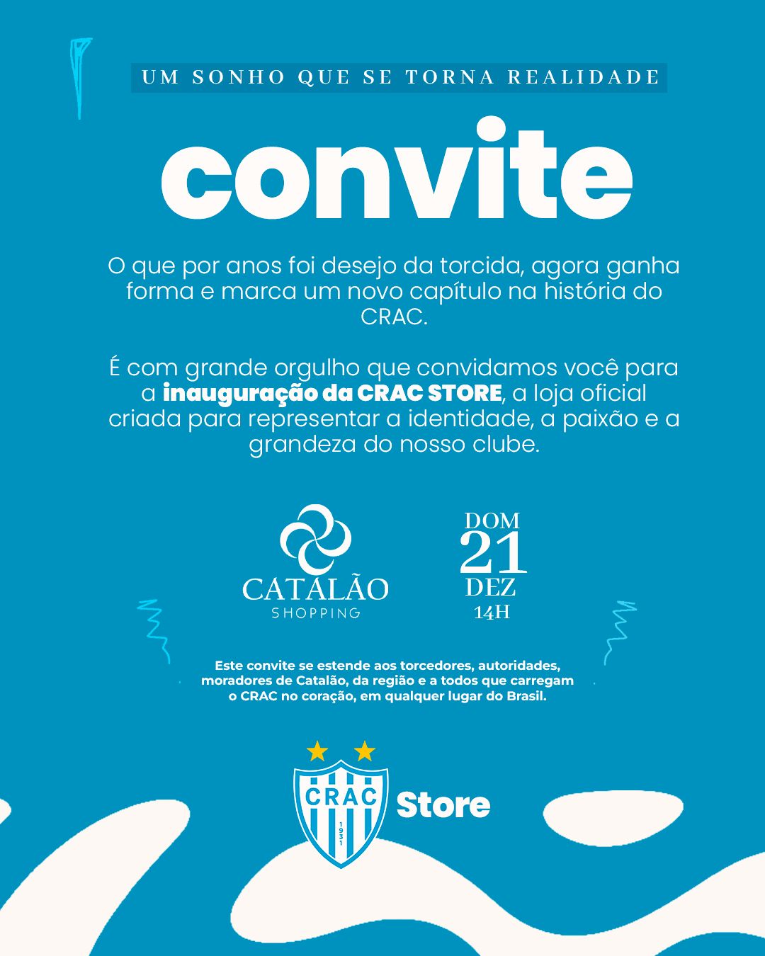 O que por anos foi um desejo da torcida do Clube Recreativo e Atlético Catalano (CRAC), agora se torna realidade. Neste domingo (21/12), às 14h, será inaugurada a CRAC Store, a loja oficial do clube, localizada no Catalão Shopping.