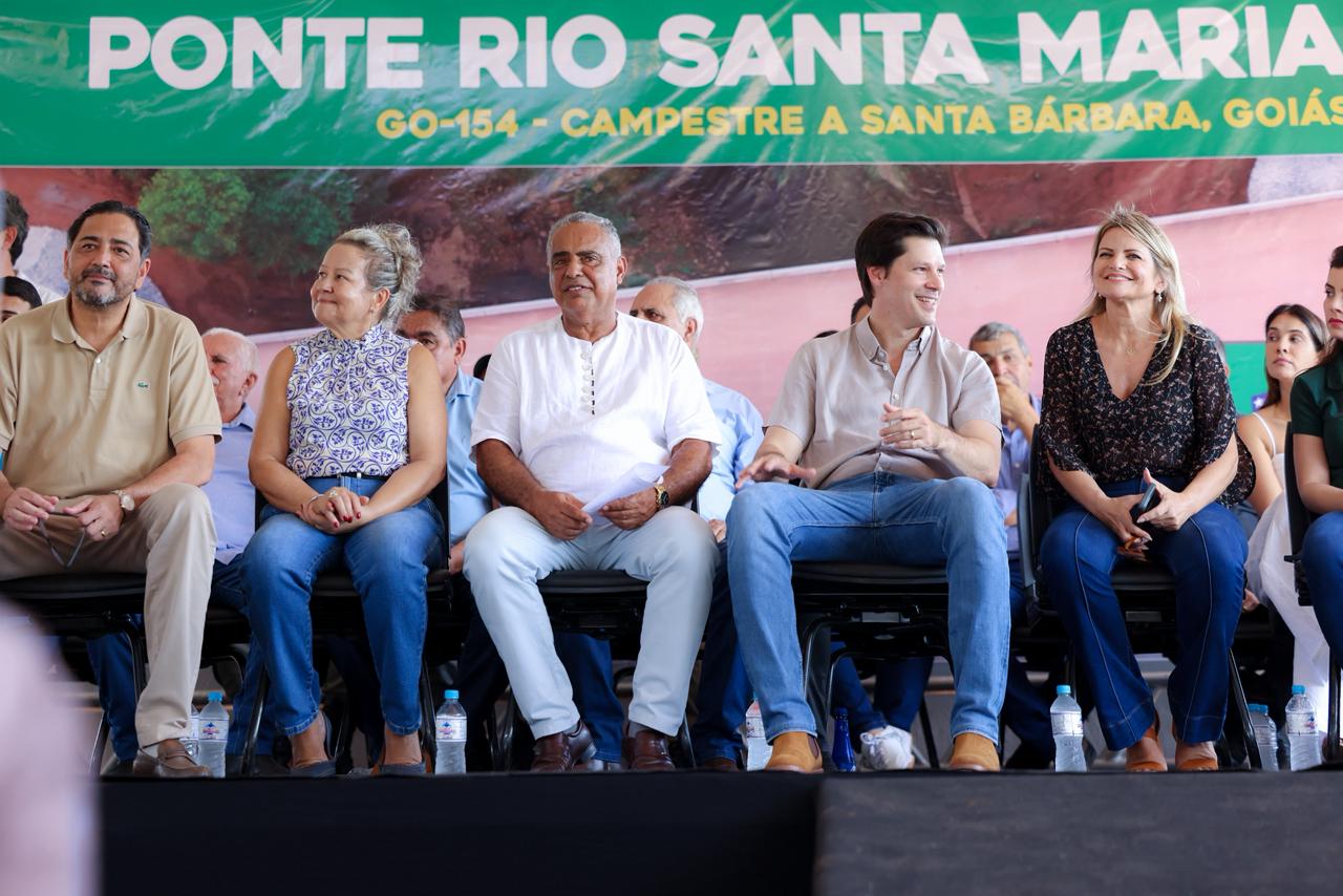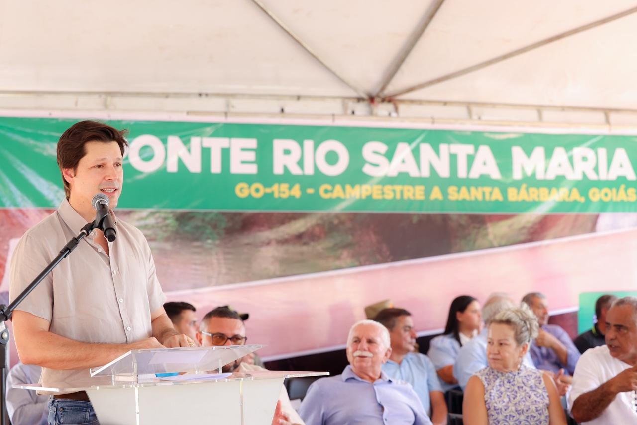 O vice-governador Daniel Vilela inaugurou, nesta sexta-feira (12/12), a nova ponte sobre o rio Santa Maria, na GO-154. A estrutura, localizada no trecho que liga as cidades de Campestre de Goiás e Palmeiras de Goiás a Santa Bárbara, reduzirá o tempo de viagem e interligará as rodovias GO-050 e GO-060. A obra foi concluída em tempo recorde, de apenas 11 meses, com investimento superior a R$ 6,7 milhões oriundos do Tesouro Estadual.